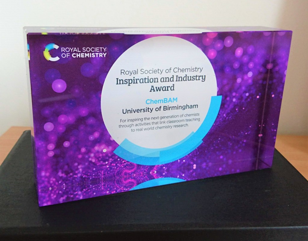 It’s a huge honour to have received the Inspiration and Industry award and is a testament to the hard work and dedication of all the people who have volunteered for ChemBAM. The award recognises the efforts that ChemBAM has made towards opening up chemistry to disadvantaged groups. The ChemBAM team would like to thank everyone who has given their time, either in visiting schools or in generating content for the website.