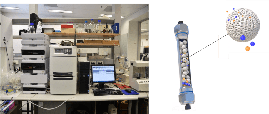 SEC works by trapping smaller molecules in the pores of the adsorbent (“stationary phase”). This process is usually performed within a column, which typically consists of a hollow tube tightly packed with micron-scale polymer beads containing pores of different sizes. The column used is filled with beads containing many pores (Fig. 1). The pore sizes of these beads are used to estimate the dimensions of macromolecules.