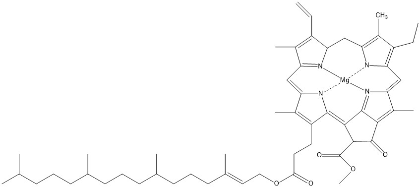 These green pigments can be found in tissue of green plants. More precisely, they are located in chloroplast (an organelle in plant cell). The two types of chlorophylls have a slightly different colour and chemical structure. The difference between the two types is in the functional group adjacent to the second pyrrole of the compound. A characteristic to both is magnesium ion (Mg 2+) located in the centre of the heme structure.