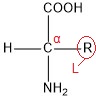 All proteinogenic amino acids, with the exception of Proline, belong among α-amino acids. The “α-“ in the name means that the amine group is bonded to carbon in alpha position to the carboxyl group. Furthermore, all proteinogenic amino acids, except Glycine, possess stereogenic centre and have L-configuration on the carbon adjacent to the carboxyl group. The letter “L-“ relates to stereochemistry of the compound and tells us about the relative configuration of the molecule, compared to the enantiomers of glyceraldehyde as the standard compound.