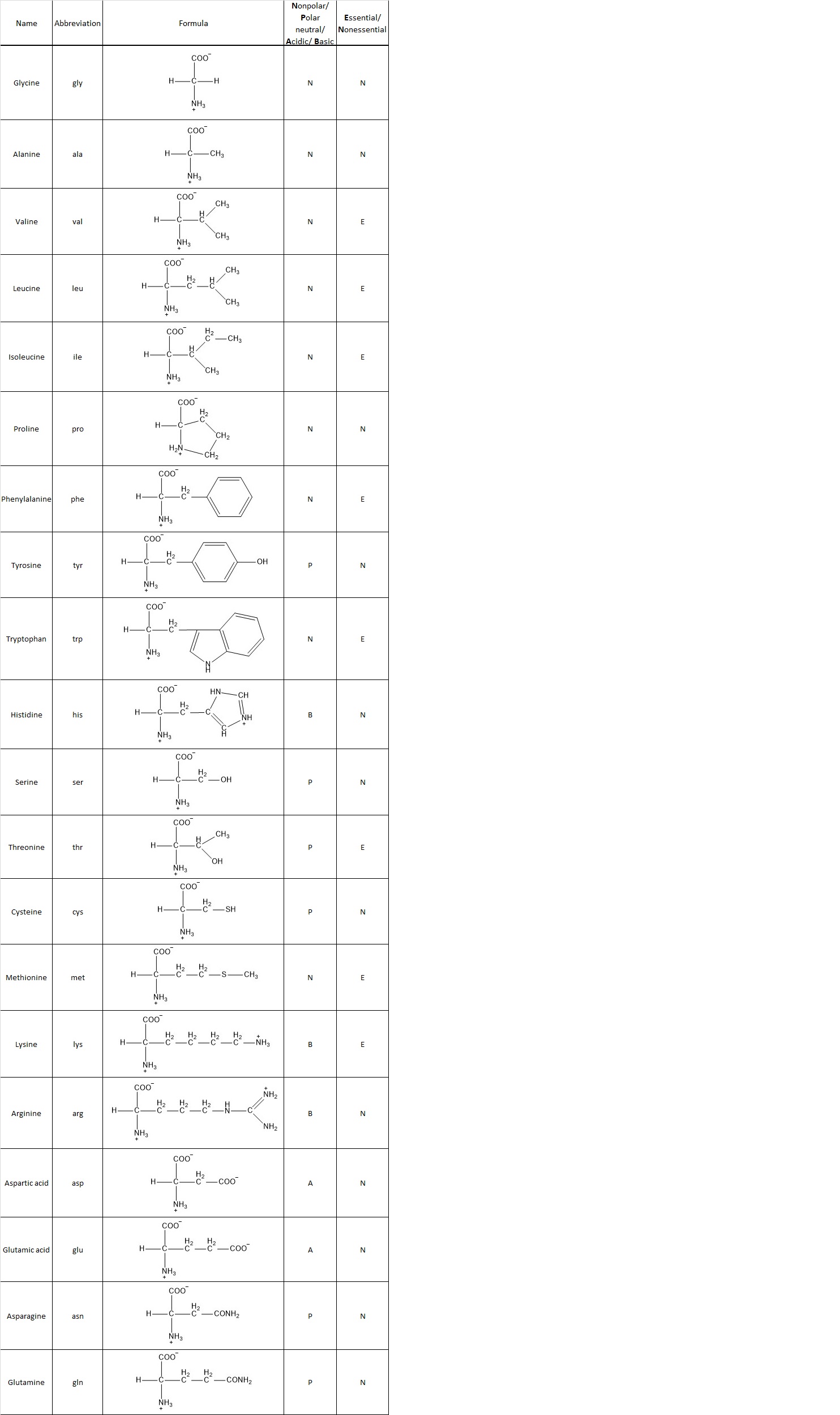 | Name | Abbreviation | Formula | Nonpolar/ Polar neutral/ Acidic/Basic | Essential/ Nonessential |