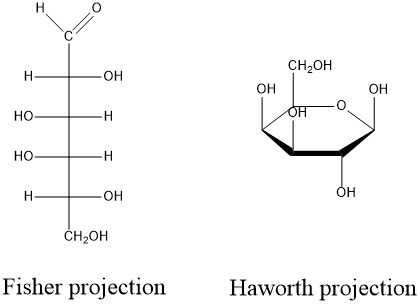 Hemiacetal bond can be generated between the carbonyl (ketone/aldehyde) carbon and the hydroxyl (–OH) group on the 4th or 5th carbon atom in aqueous environment. Therefore we get a cyclic form (called Haworth projection) of saccharides which is lower in energy than the chain form and hence occurs predominantly in nature. In this form the molecule has increased number of chiral centres.