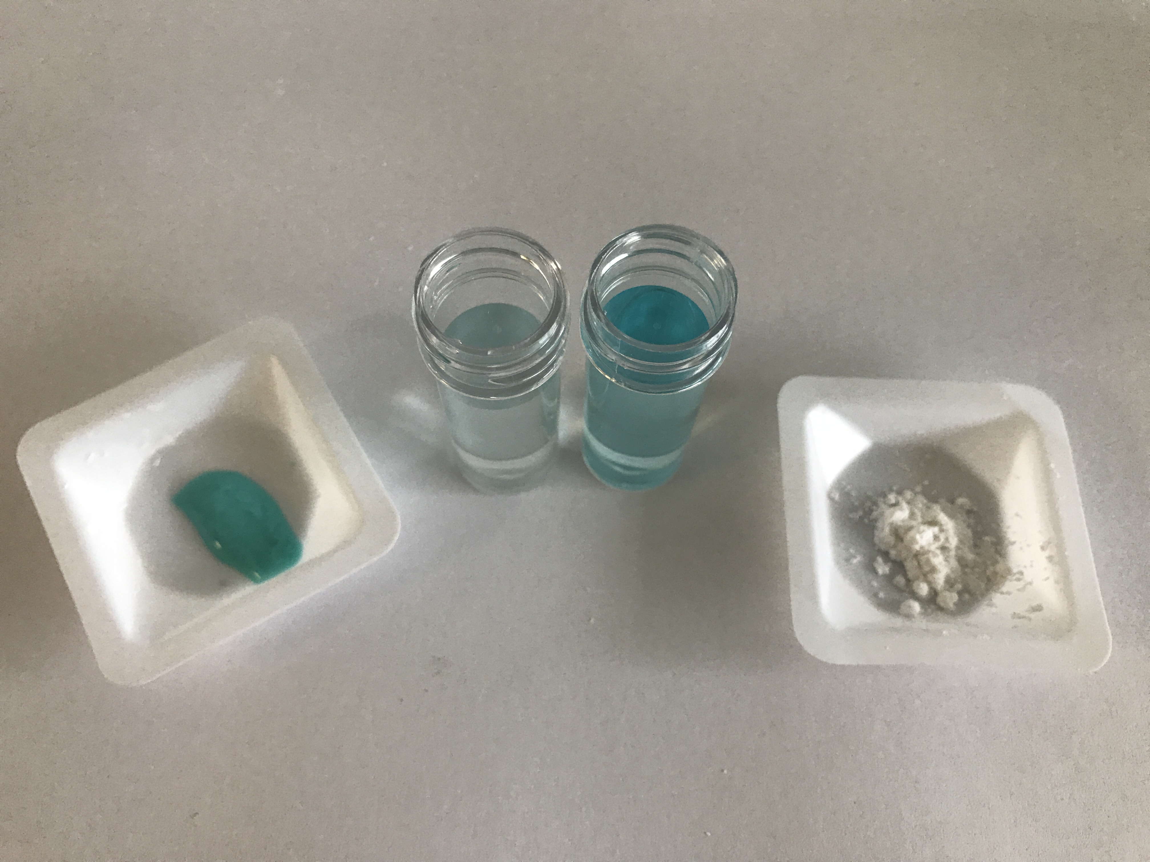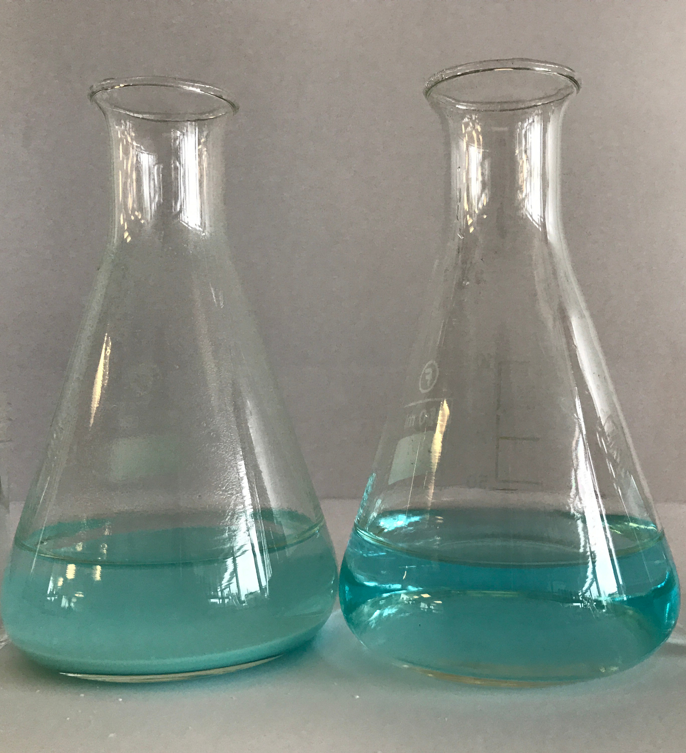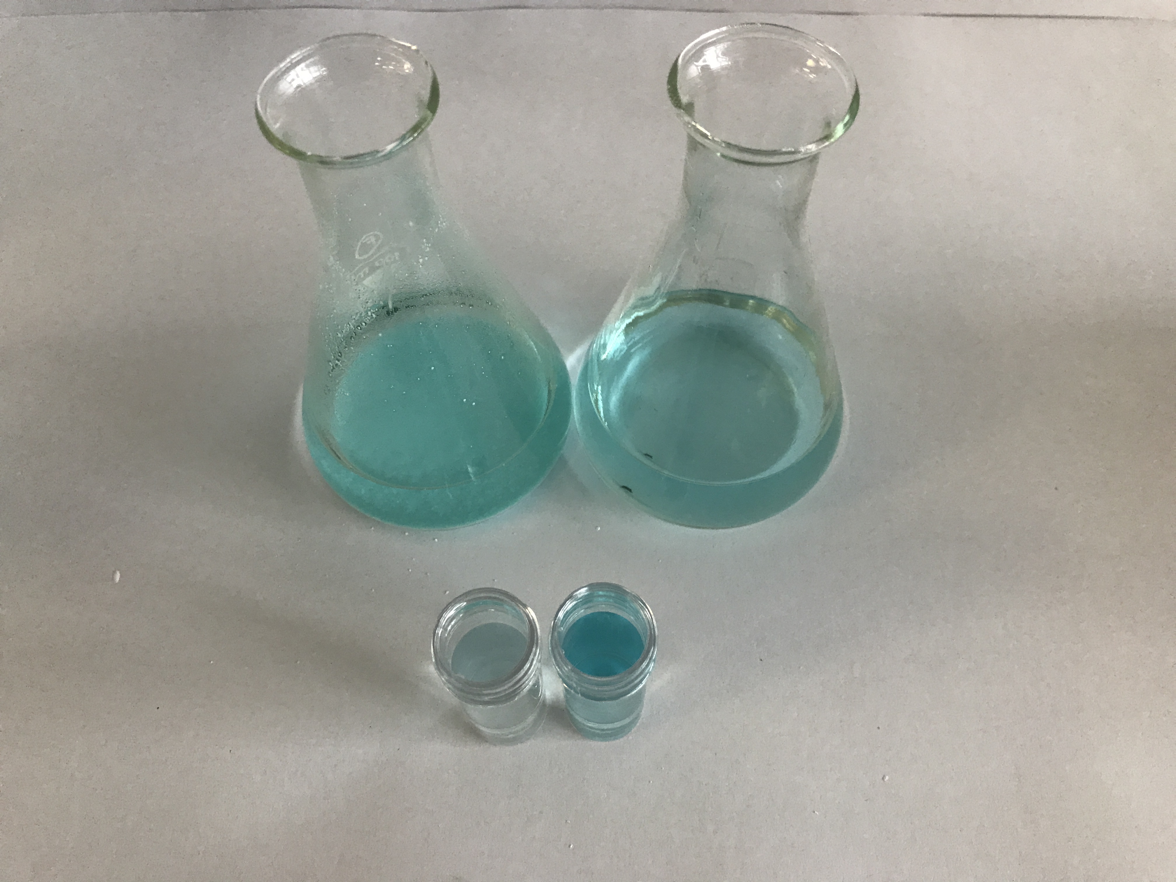 Measure out 50 mL of copper sulfate solution into two glass conical flasks, labelled A and B. Keep flask A as a control solution. Add 1 g of zeolite powder to solution B, and swirl the solution, continually for 5 min. Leave the solution to settle and move on to part 2.