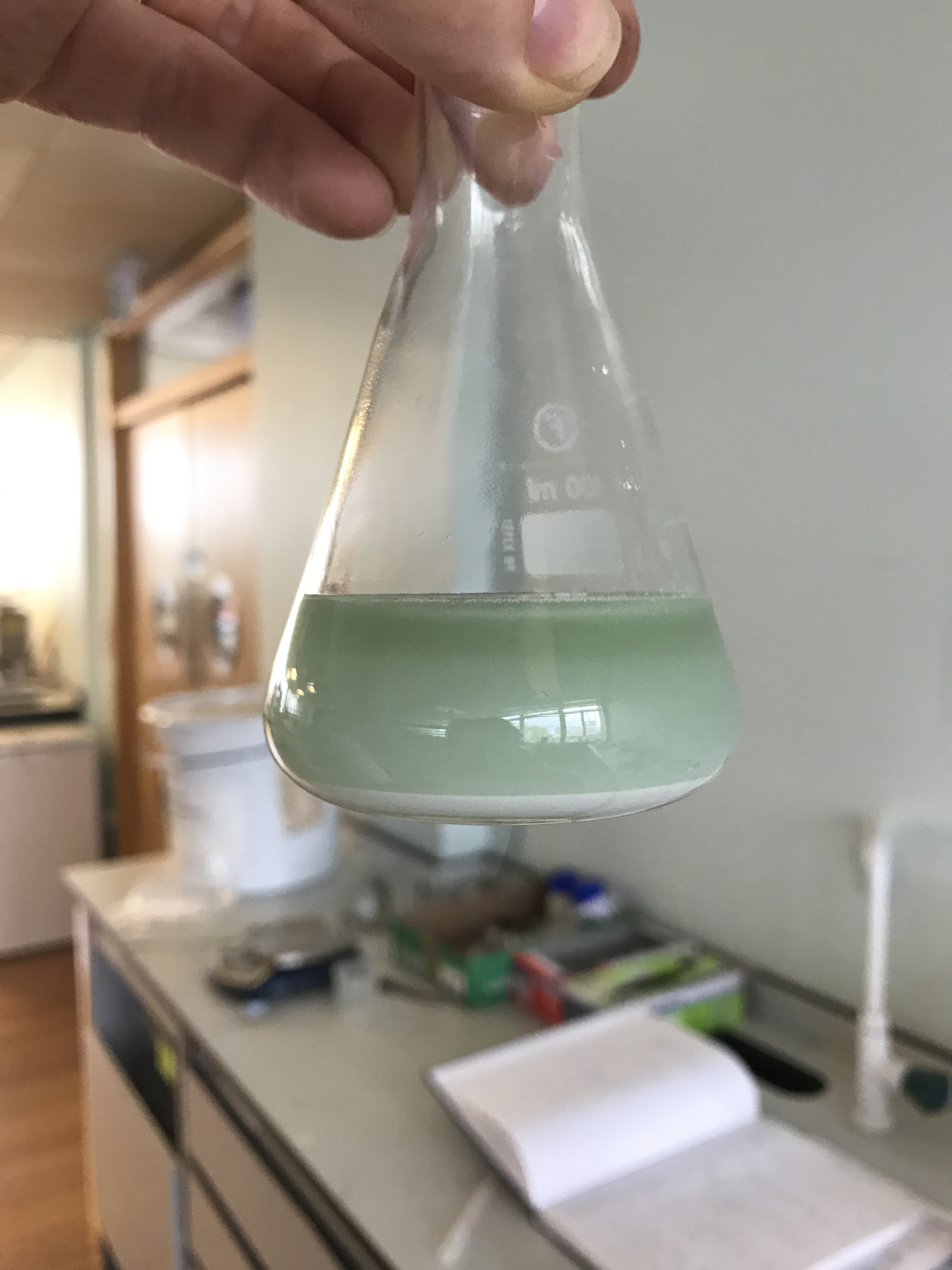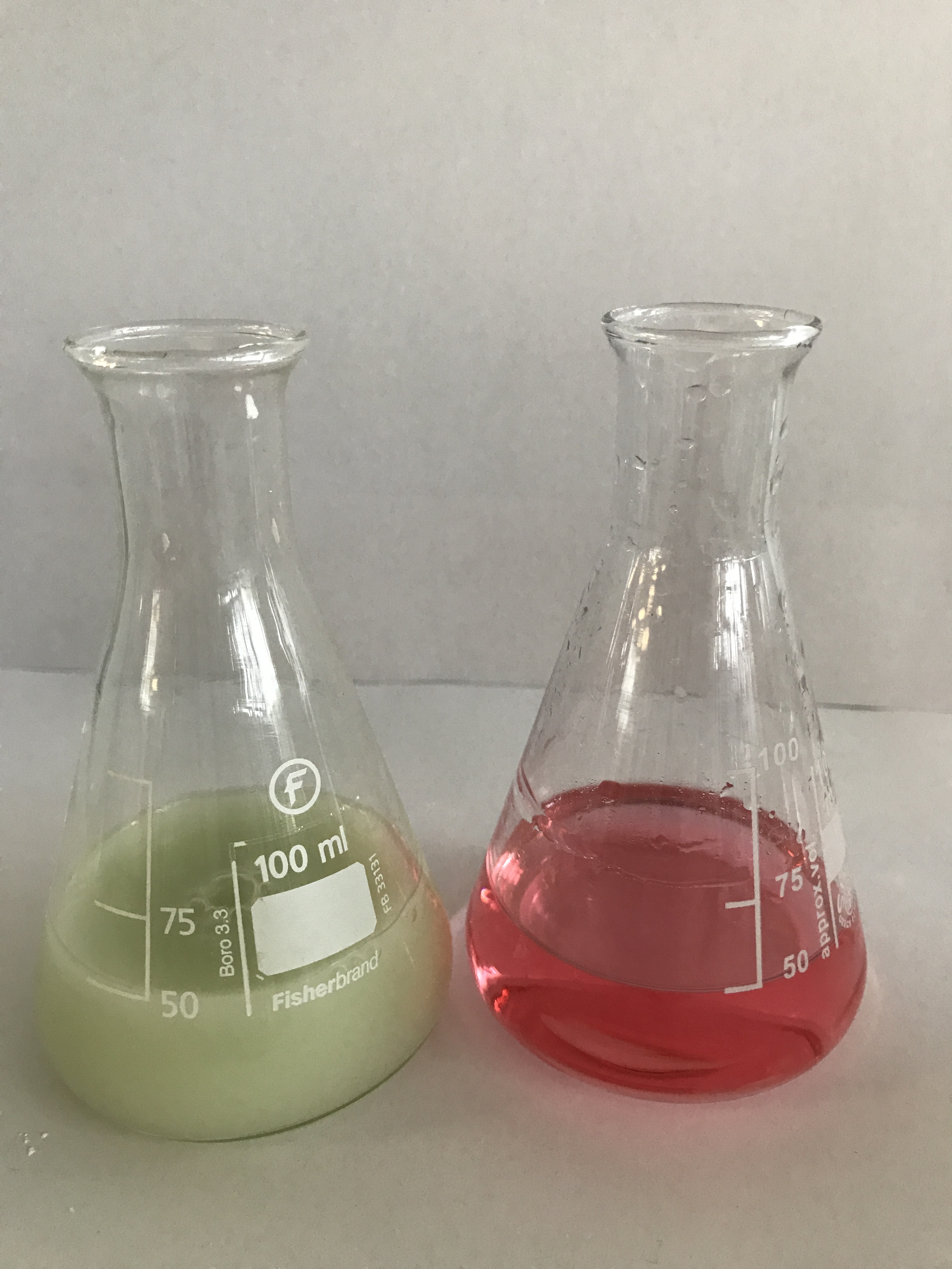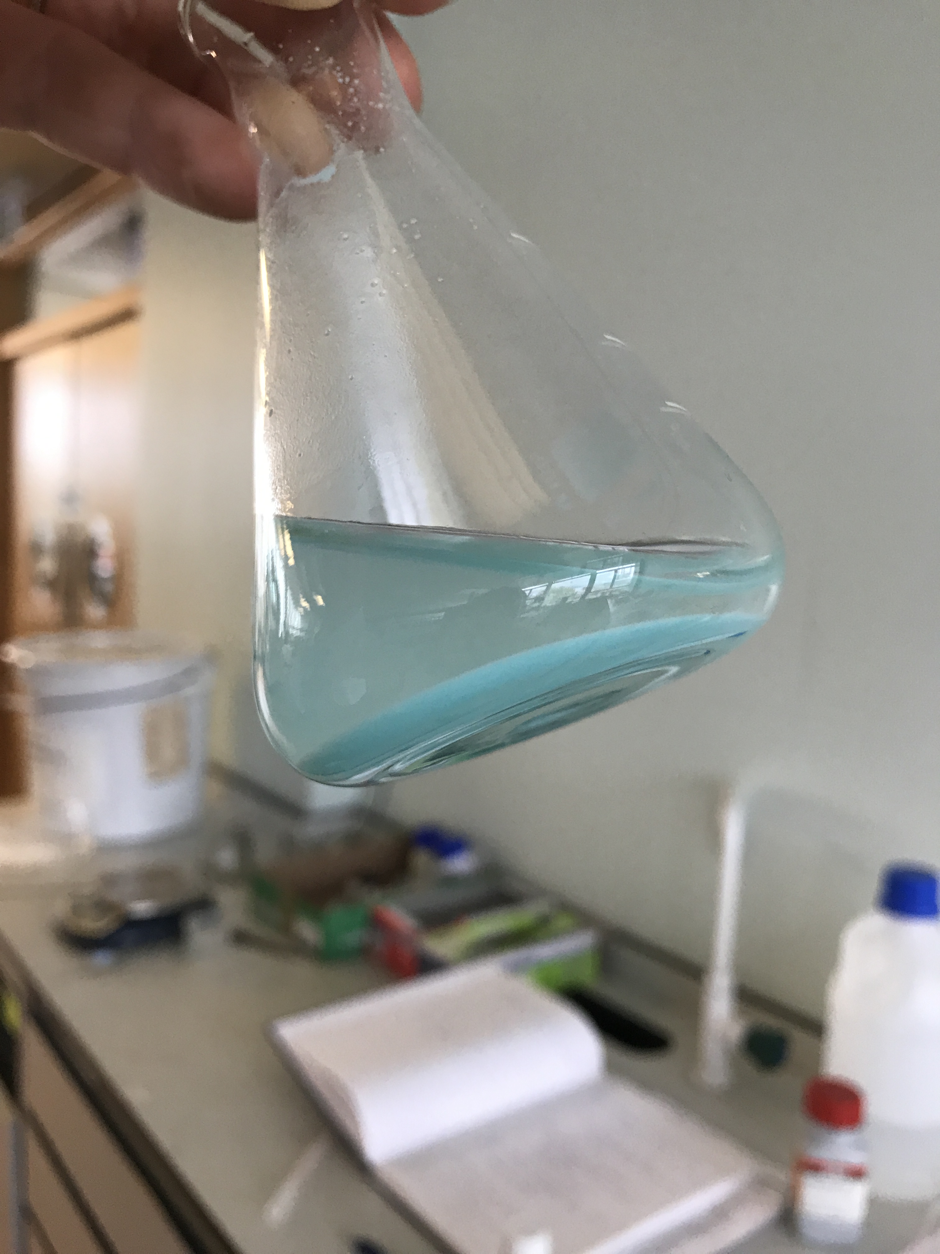 Measure out 50 mL of copper sulfate solution into two glass conical flasks, labelled A and B. Keep flask A as a control solution. Add 1 g of zeolite powder to solution B, and swirl the solution, continually for 5 min. Leave the solution to settle and move on to part 2.