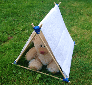 - Materials to cover the tent – (we used kitchen roll, cotton fabric and plastic sheeting cut from a rubble sack )