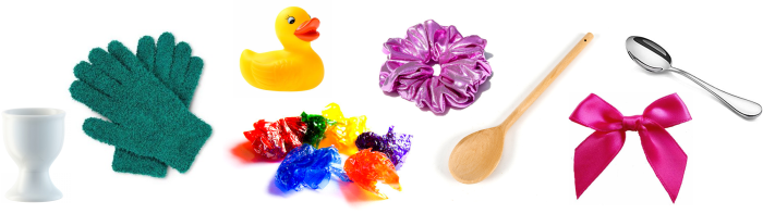 You don’t have to put the objects in a bag, but it helps for getting children to focus on touch and texture rather than what the object looks like. This activity would also work well as a scavenger hunt. Go and find a crinkly object, a soft object etc.