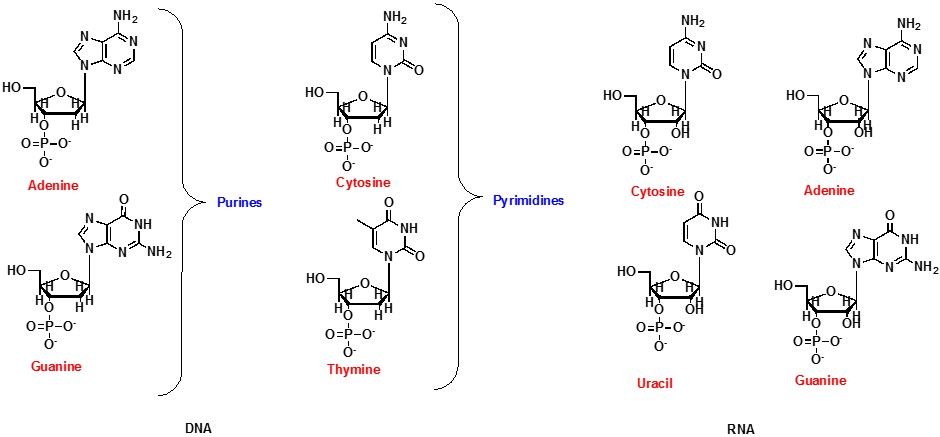 RNA on the other hand is made of ribose sugars (these contain an extra oxygen at the 2’ position) but in most cases the bases are the same. However, RNA uses uracil instead of thymine, which lacks a methyl substituent in the 5’ position. Uracil is much less energetically expensive to produce, which could be why the base is used preferentially in RNA.