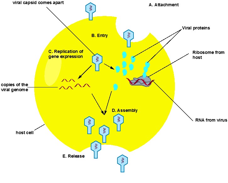 RNA viruses on the other hand are made entirely of RNA and are acellular, meaning that they do not live on their own. The most important thing to remember about viruses is that they require a host to survive. The RNA in these types of virus exist in a capsid protein shell and reproduce by infecting a host cell and reprogramming their ribosomes to create more viral proteins instead of the host proteins.