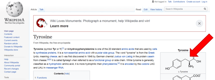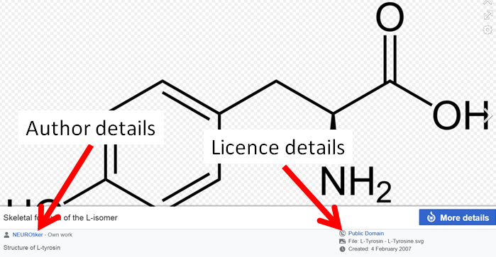 Wikipedia itself can also be a good source of images. Again, just make sure you follow the rules of the licence. e.g. for the page on tyrosine, if you click on the image of the molecular structure (red arrow)…